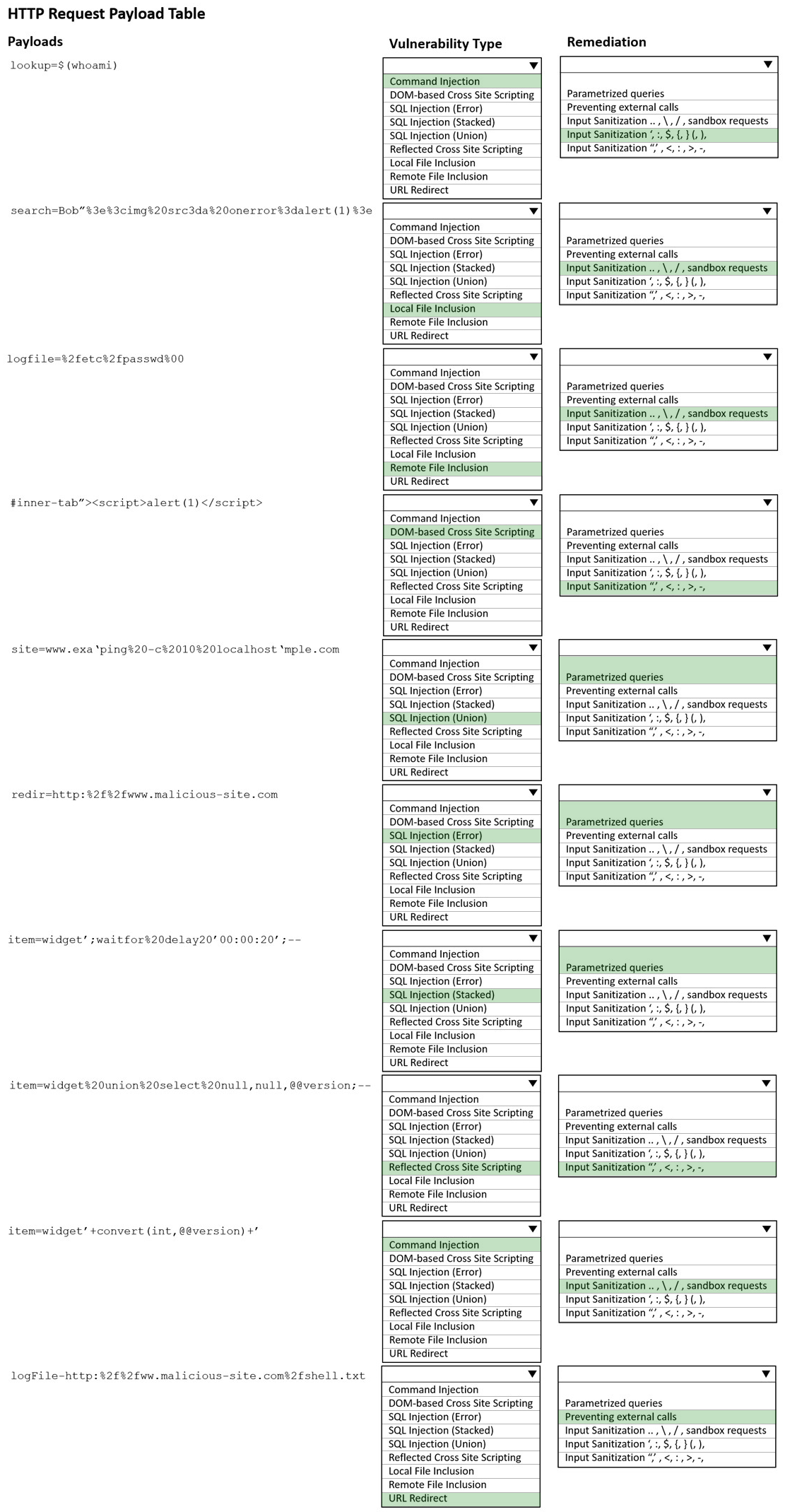 HOTSPOT You are a security analyst tasked with hardening a web server. You have been given a list of HTTP payloads that were flagged as malicious.