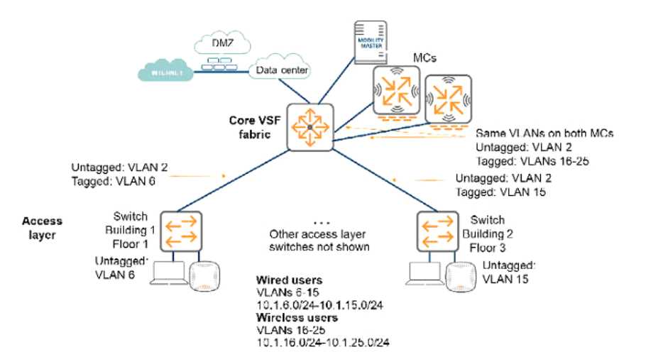 the network The core switches route all traffic and support all VLANS. The access fayer switches do