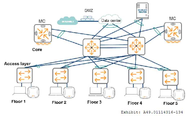 The exhibit shows the topology for a new Aruba solution. The MCs are in a ctuster and support all of