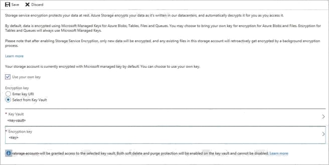 2. On the Settings blade for the storage account, click Encryption. Select the Use your own key option, as shown in the