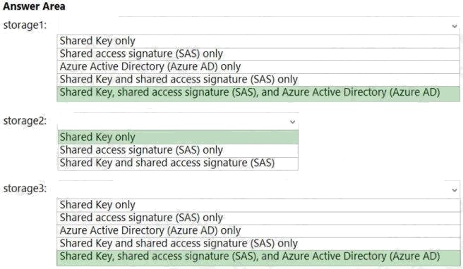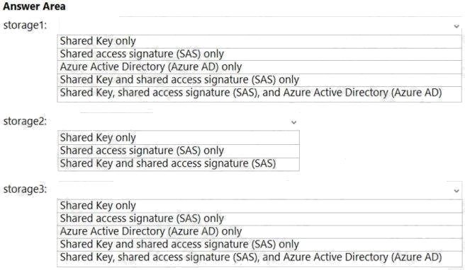 Which authorization types can you use for each storage account? To answer, select the appropriate options in the answer