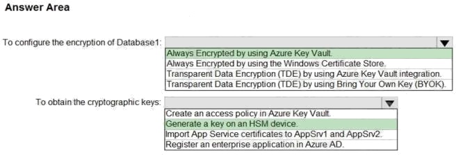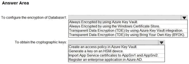 How should you configure the encryption settings for Database1? To answer, select the appropriate options in the answer