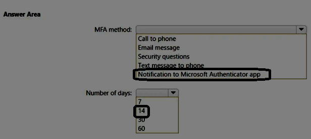 Which multi-factor authentication (MFA) method can the user use, and how many days does the user have to register for MFA? To answer, select the appropriate options in the answer area.