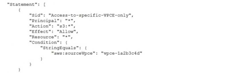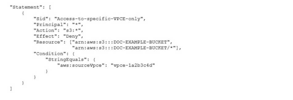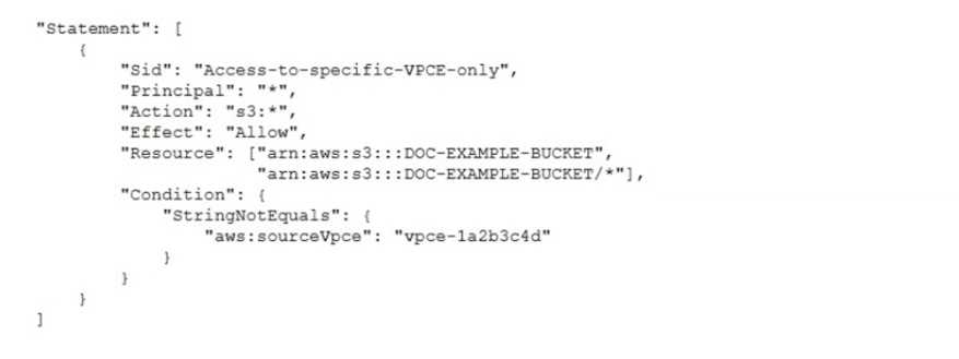 A security engineer needs to configure an Amazon S3 bucket policy to restrict access to an S3 bucket that is named DOC-EXAMPLE-BUCKET. The policy must allow access to only DOC-EXAMPLE-BUCKET from only the following endpoint vpce-1a2b3c4d. The policy must deny all access to DOC-EXAMPLE- BUCKET if the specified endpomt is not used. Which bucket policy statement meets these requirements? A. B. C. D.