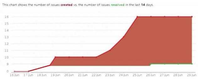 On June 29, the red line (created issues) is significantly above the green line (resolved issues),