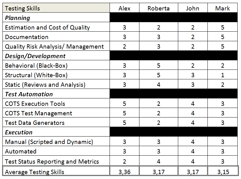 Consider the following analysis of testing skills performed on four people: Alex, Robert, John and