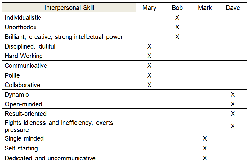 Your test team consists of four members (Mary, Bob, Mark, Dave) with different interpersonal skills.