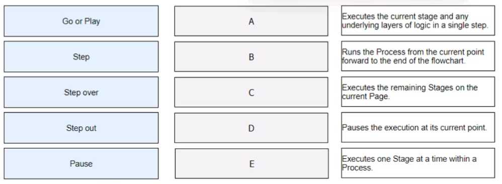 Drag and drop the Blue Prism debug tool names on the left, onto the placement boxes (A- E) so that