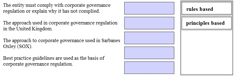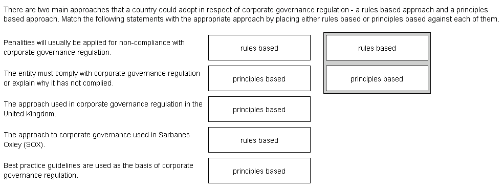 regulation - a rules based approach and a principles based approach. Match the following statements