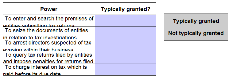 Identify which of the following are powers that a government would typically grant it's tax authority