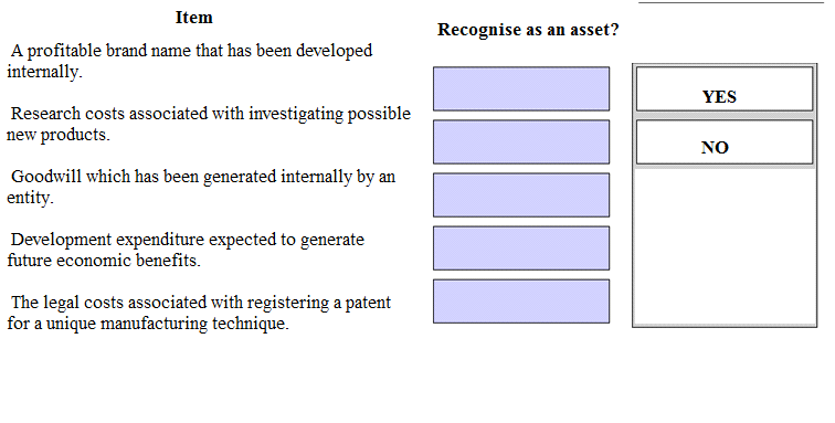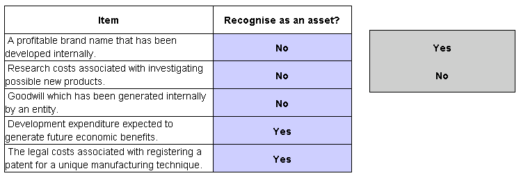 of an entity in accordance with IAS 38 Intangible Assets. Place either yes or no as appropriate against