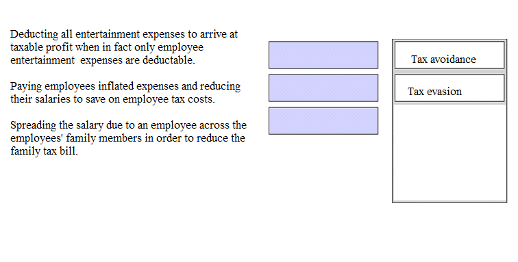 Identify whether the scenarios below are examples of tax evasion or tax avoidance, by placing either