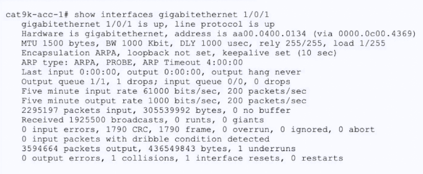 Refer to the exhibit. The switch cat9k-acc-1 connects users to the campus LAN. Printing services are inaccessible through the network. Which interface issue is causing the connectivity problems?