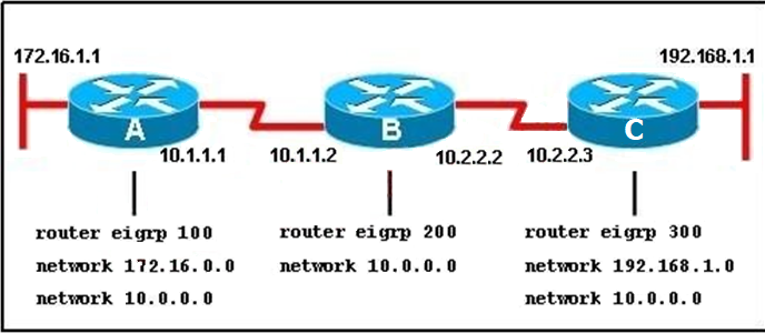 Refer to the exhibit. When running EIGRP, what is required for RouterA to exchange routing updates with RouterC?
