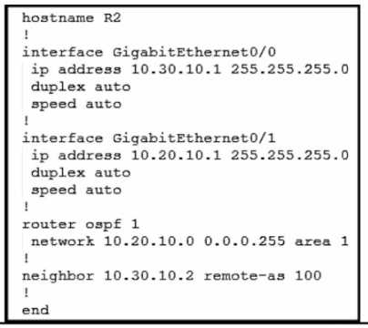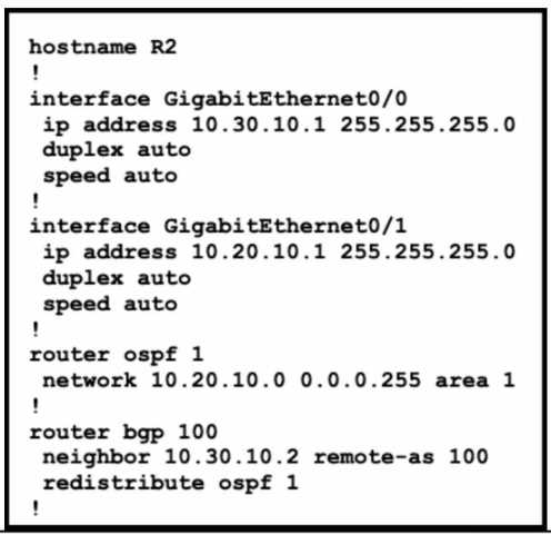 The command redistribute ospf 1 match external is missing on router R2. This command is needed to