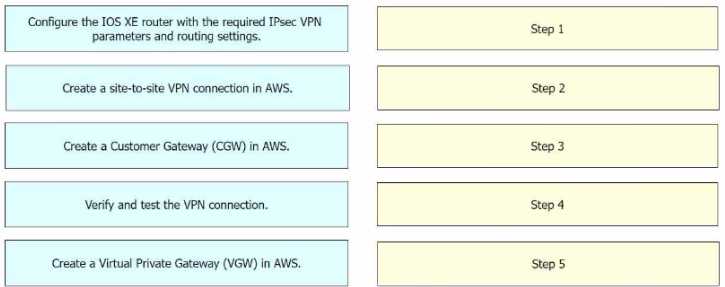 Drag and drop the steps from the left onto the order on the right to configure a site-to-site VPN