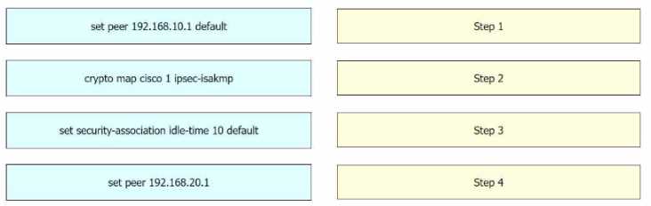 Step 1 = crypto map cisco 1 ipsec-isakmp Step 2 = set peer 192.168.10.1 default Step 3 = set peer