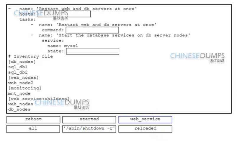 Drag and drop the code snippets from the bottom onto the boxes in the code in the Ansible playbook