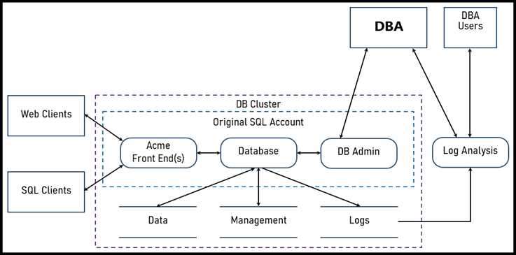 Two types of clients are accessing the front ends and the core database that manages transactions,