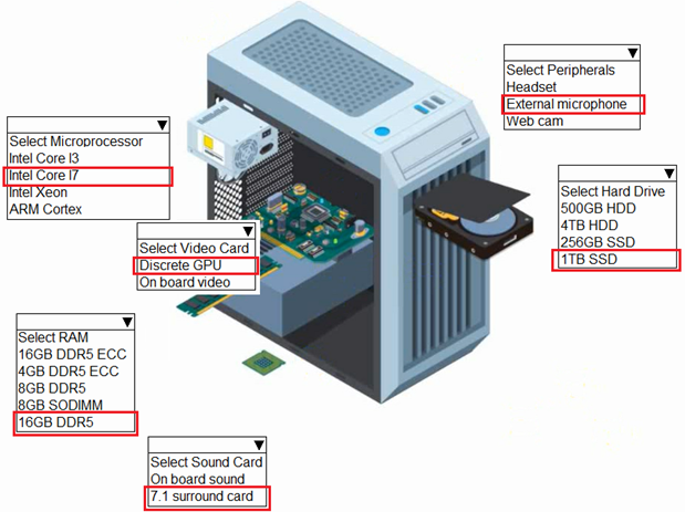 For the desktop that will be a gaming workstation: Microprocessor: intel xeon, Video card: Discrete GPU, RAM:16 DDR5, Surround card: 7.1 surround card, 7.1 surround card, Peripheral external microphone, Hard drive: 500 GB HDD