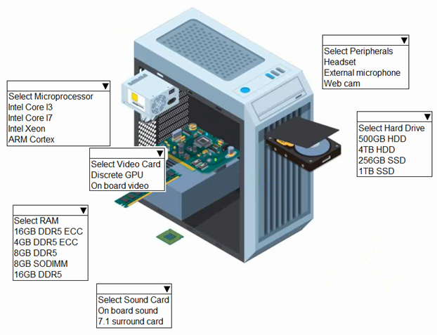 For the desktop that will be a gaming workstation: Microprocessor: intel xeon, Video card: Discrete GPU, RAM:16 DDR5, Surround card: 7.1 surround card, 7.1 surround card, Peripheral external microphone, Hard drive: 500 GB HDD