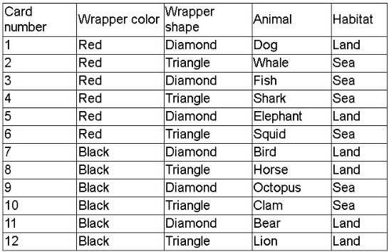 You have categorical inputs (wrapper color, shape, animal) and a binary target (sea vs. land). A