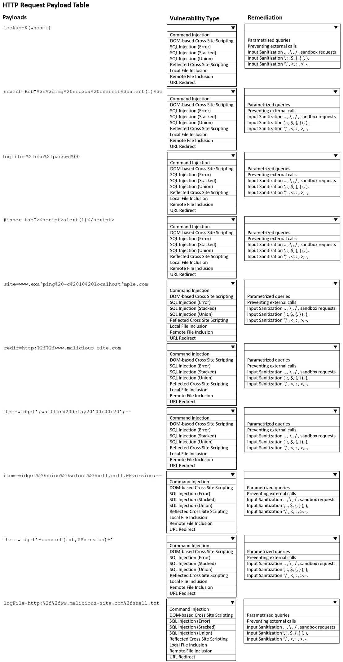 HOTSPOT You are a security analyst tasked with hardening a web server. You have been given a list of HTTP payloads that were flagged as malicious.
