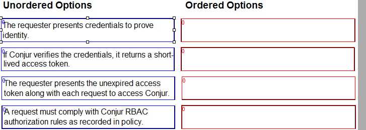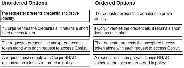 Arrange the steps of a Conjur authentication flow in the correct sequence.
