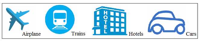 “On screen, the choices ‘Airplane’, ‘Trains’, ‘Hotels’, ‘Cars’ and ‘Taxis’ must be included in a