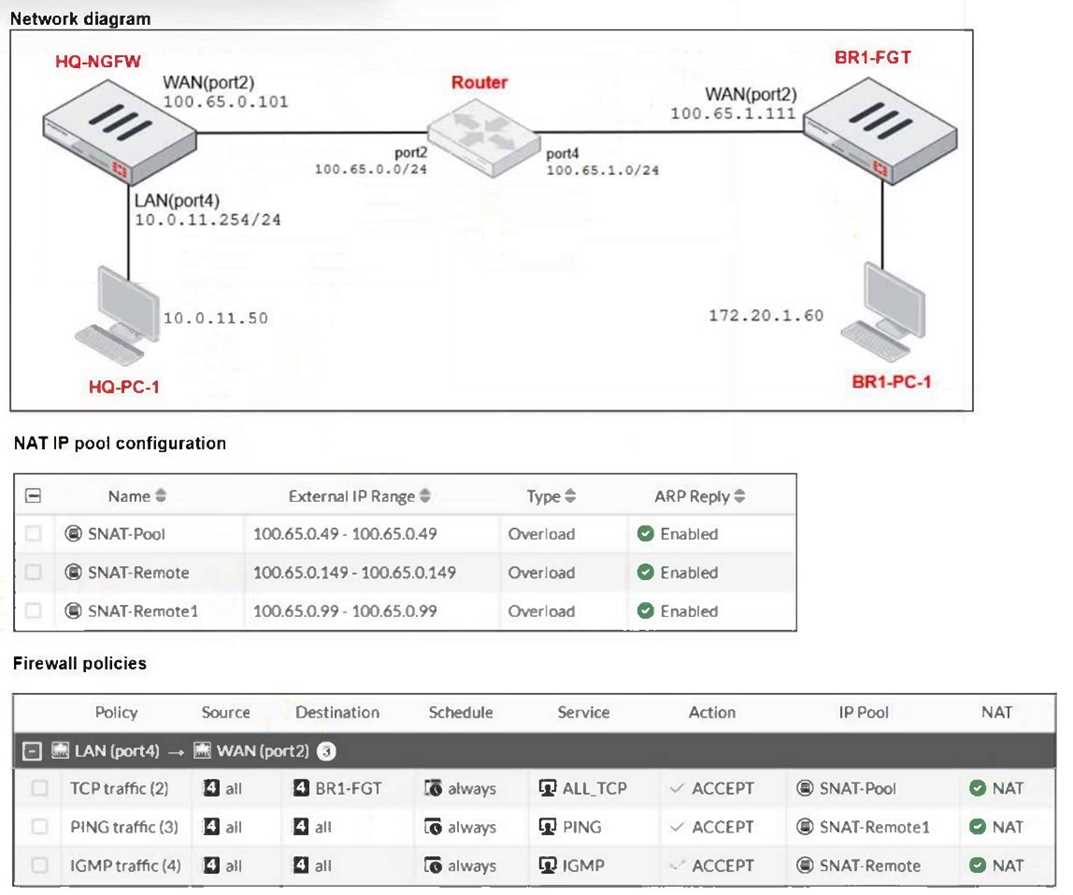 100.65.0.99. Therefore, traffic matching this policy (ping from HQ-PC-1 to BR1-FGT) will use