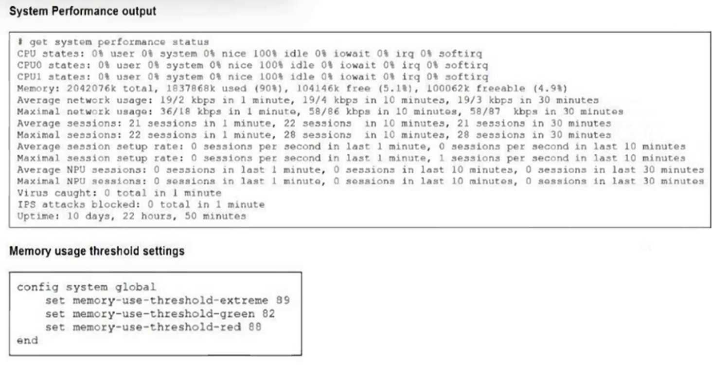 Since memory usage is at 90%, exceeding the red threshold (88%), FortiGate enters a state where