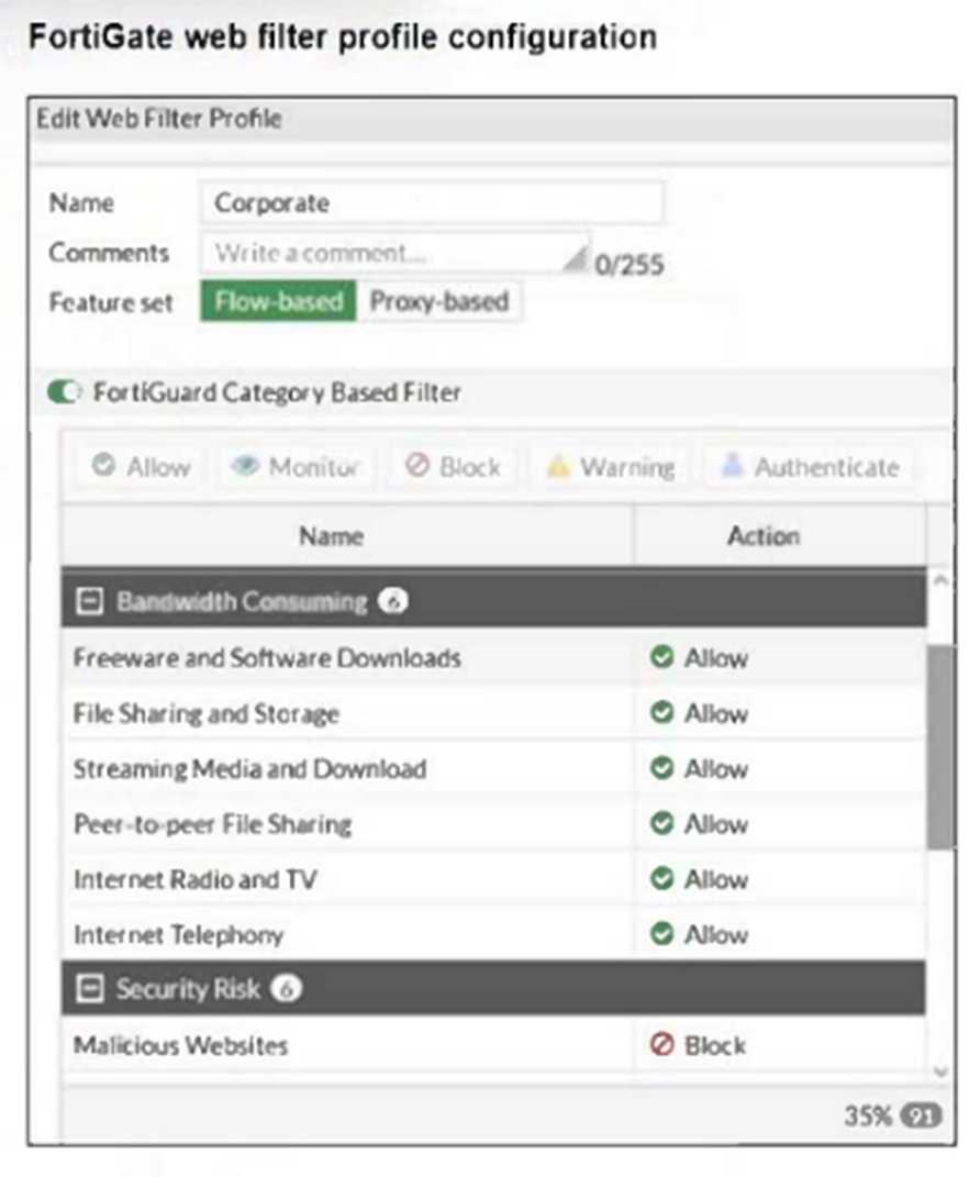 The exhibit shows the FortiGuard Category Based Filter section of a corporate web filter profile.