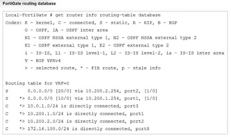 The routing table in the exhibit shows two default routes (0.0.0.0/0) with different administrative