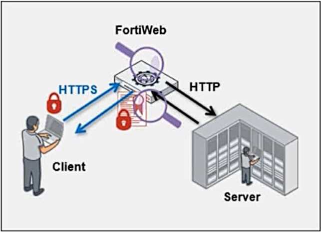 In the diagram, FortiWeb is positioned between the client and the server, handling encrypted HTTPS