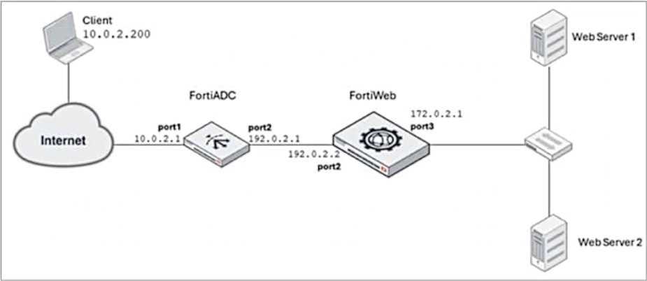 and FortiADC, so that FortiWeb can directly inspect and protect the incoming traffic before FortiADC