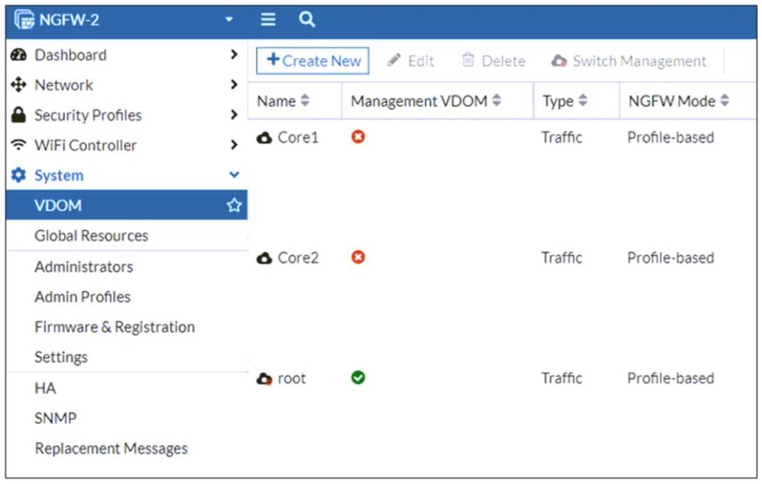 Refer to the exhibit, which shows the VDOM section of a FortiGate device.
