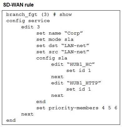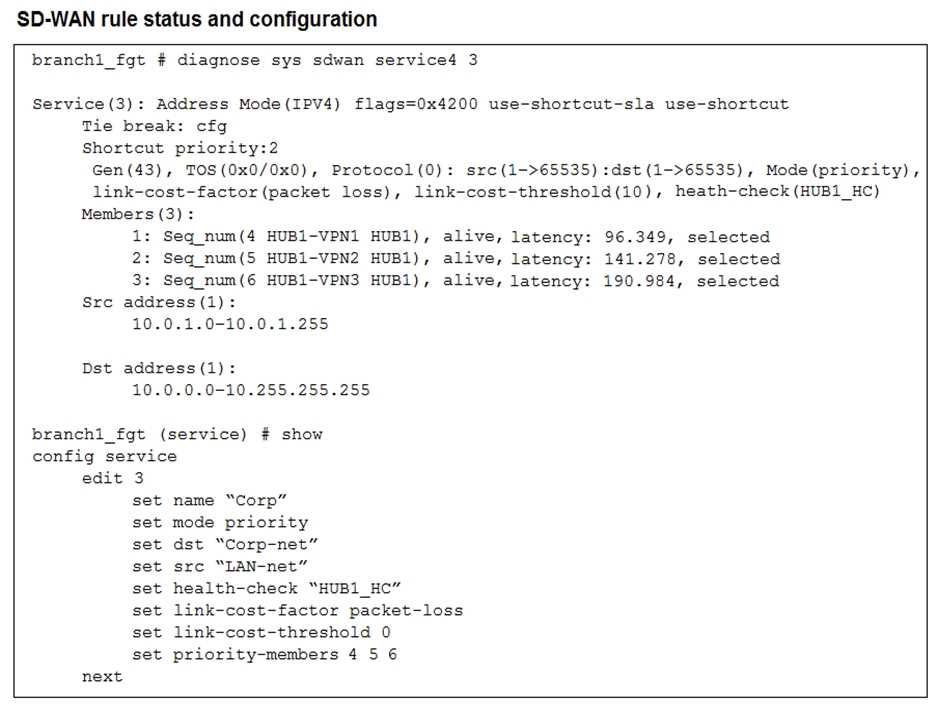 Refer to the exhibits, which show the configuration of an SD-WAN rule and the corresponding rule