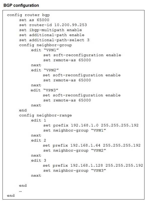 The exhibit shows the BGP configuration on the hub in a hub-and-spoke topology. The administrator