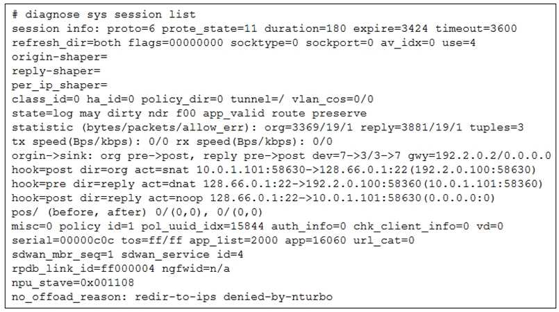 The line no_offload_reason: redir-to-ips denied-by-nturbo shows that the session is not offloaded to