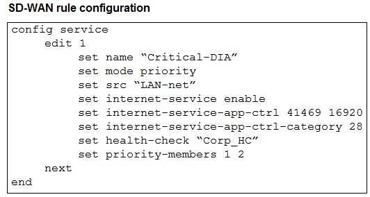 The SD-WAN rule (config service edit 1) is configured with set mode priority. This means the rule
