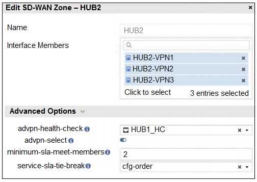 members (in this case, HUB2-VPN1, HUB2-VPN2, and HUB2-VPN3) to pass the defined SLA health