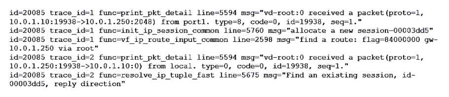 The debug flow output shows the result of a diagnose command that captures the traffic flow