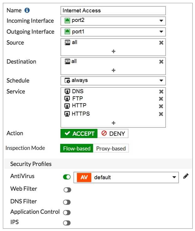 Security profiles: The security features to apply to the traffic, such as antivirus, web filter, application