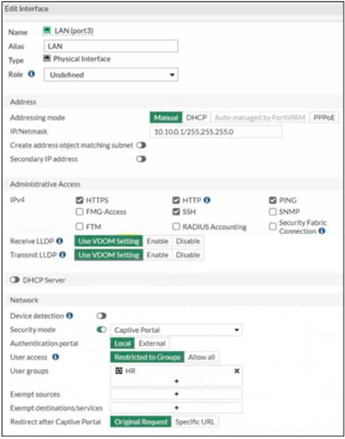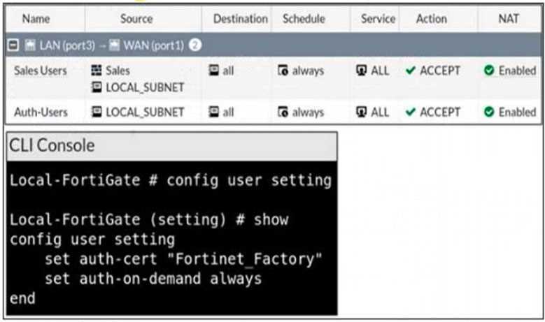 The exhibit shows a diagram of a FortiGate device connected to the network and the firewall policy