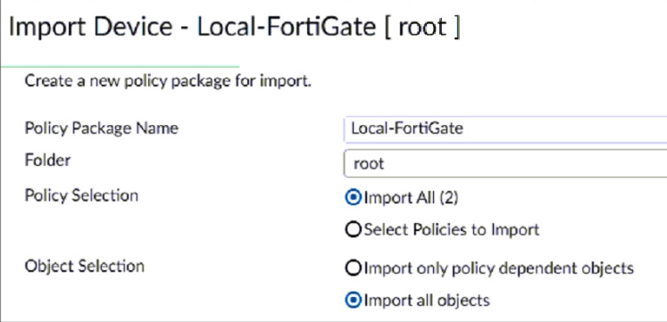 An administrator is importing a new device to FortiManager and has selected the options shown in the exhibit.