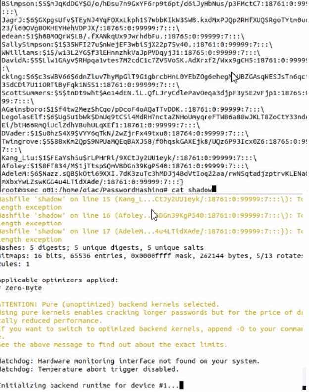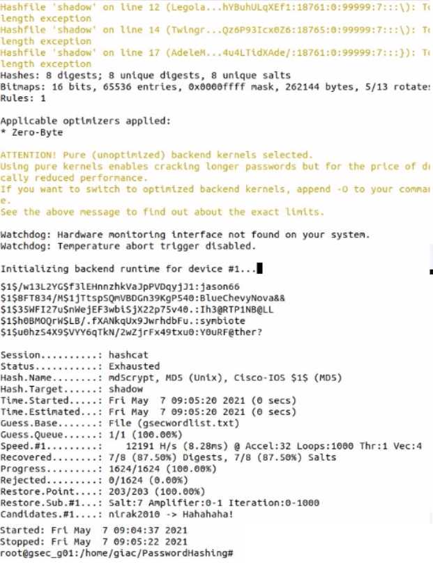 • The shadow file (shadow) and Hashcat wordlist (gsecwordlist.txt) are located in the directory