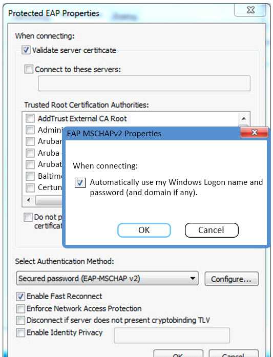 Refer to the exhibit. Based on the configuration of a Windows 802.1X supplicant shown, what will be the outcome when ‘Automatically use my Windows logon name and password’ are selected?