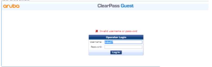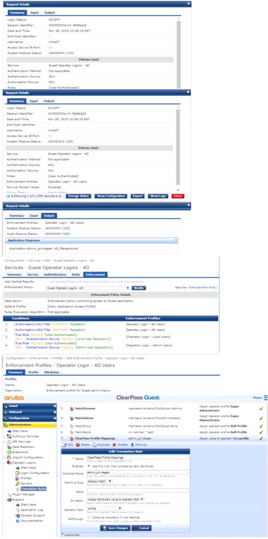 Refer to the exhibit. The customer configured a guest operator access by creating a custom operator profile and the built- in universal ClearPass profile mapping translation rule. When he tests the setup, he gets authentication failed. Using the streenshots sent by the customer as a reference, what would suggest to the customer to fix the issue?