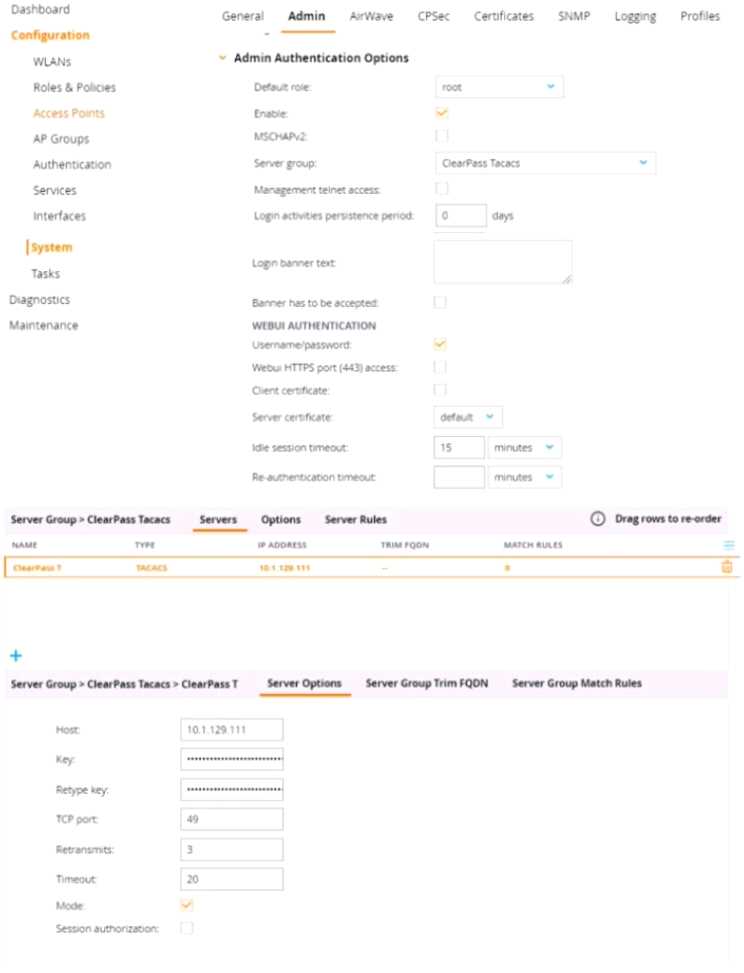 Refer to the exhibit. A customer hat configured the Aruba Controller for administrative authentication using ClearPass as A TACAC5 serve' During tasting, the read-only user is getting the root access role What could be a possible reason for this behavior? (Select two.)