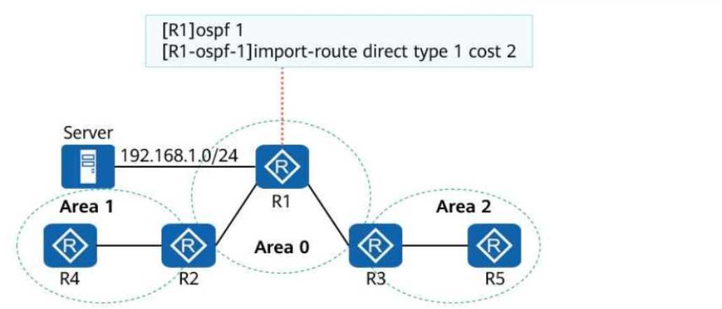 routers are GE interfaces, and their costs are not changed. The import-route command is run on R1.